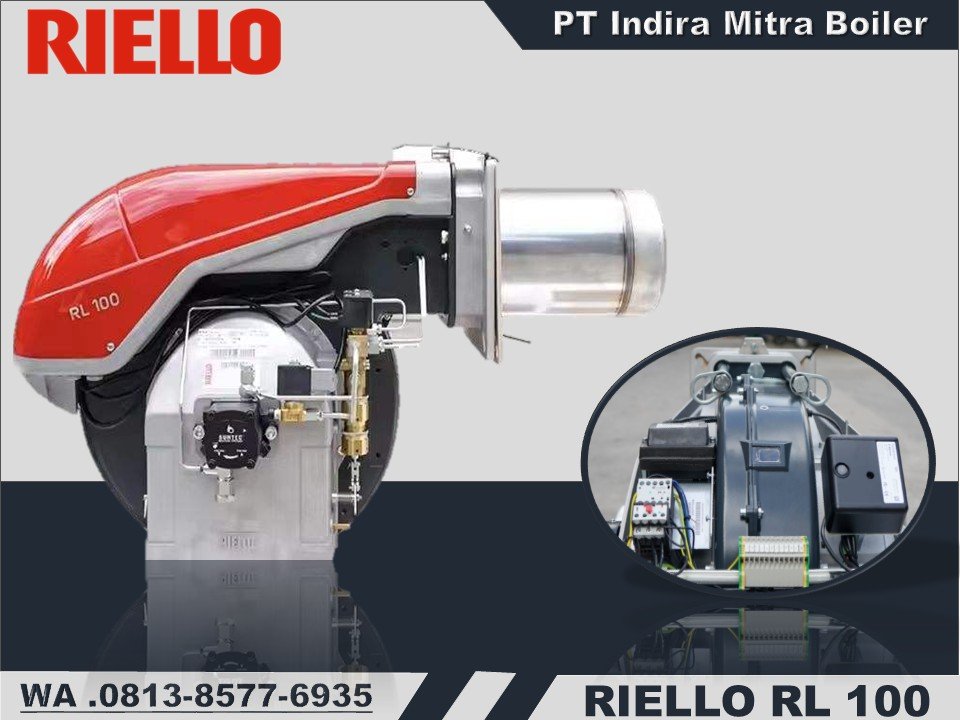 Seri burner Riello RL 100 adalah alat pembakaran Light oil atau campuran minyak ringan dan biodiesel yang mencakup rentang daya tembak dari 306 Mcal hingga 1020 Mcal/h atau setara dengan keluaran bahan bakar minyak ringan 30-100 Kg/jam, burner ini telah dirancang untuk digunakan pada boiler air panas atau uap, serta boiler minyak thermal. Pengoperasiannya 2 nozzle “Two stage” dilengkapi dengan panel kontrol berbasis mikroprosesor, yang memberikan indikasi status burner dan penyebab kerusakan.