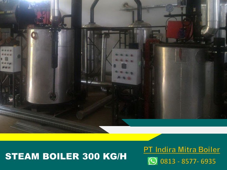 Steam Boiler dengan kapasitas 300 Kg/jam adalah jenis boiler water tube vertikal yang berfungsi untuk mengubah air menjadi uap. Proses pembentukan uap pada boiler ini terjadi saat air dipanaskan dalam pipa tabung menggunakan alat pembakar gas secara terus menerus. Bahan bakar atau udara dari luar dikendalikan secara otomatis oleh panel kontrol. Boiler ini biasanya dipakai pada mesin pabrik yang membutuhkan tekanan kurang dari 10 bar dan dapat ditempatkan dalam ruang yang tidak terlalu besar, bisa dianggap setengah dari ruang yang diperlukan oleh boiler horizontal.
