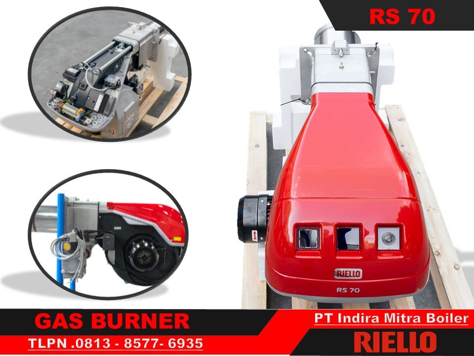 Seri Riello RS 70 adalah burner gas yang mencakup daya pembakaran 192 hingga 814 kW, dan telah dirancang untuk digunakan pada boiler air panas suhu rendah atau sedang, boiler udara panas atau uap, serta boiler minyak diatermik. Pengoperasiannya “progresif dua tahap”, burner dilengkapi dengan panel kontrol mikroprosesor yang memberikan indikasi operasi dan diagnosis penyebab kerusakan. Kinerja kipas dan kepala pembakaran yang tinggi menjamin fleksibilitas penggunaan dan kinerja yang sangat baik pada semua tingkat pembakaran. Desain eksklusifnya memastikan dimensi yang lebih kecil, penggunaan, dan perawatan yang mudah. Berbagai macam aksesori menjamin fleksibilitas kerja yang lebih tinggi.